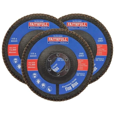 General description Pack of 3 Faithfull Aluminium Oxide Flap Discs 115 x 22mm 40 Grit, designed for rough grinding and finishing of mild steel, carbon steel, and alloys. These discs are suitable for heavy-duty applications and feature a lightweight design that reduces operator fatigue while providing better control and consistency in surface finish. Technical specifications Diameter x bore: 115 x 22mm Grit: 40 Number of flaps: 72 Usage Ideal for grinding at 15-25 degree angles on contoured surfaces. Compatible with angle grinders. Other information The layered disc design is cooler and quieter than typical grinding discs, with less vibration and reduced glazing. Self-sharpening flaps provide a longer life, approximately 30 times longer than fibre discs, resulting in fewer disc changes.