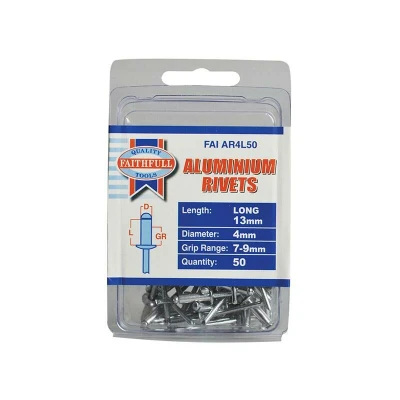General description These aluminium rivets are versatile fasteners suitable for various DIY and home improvement projects. Manufactured from high-quality aluminium with a steel pulling mandrel, these rivets are durable and reliable. They provide secure fixing from one side, making assembly easier and more efficient. Technical specifications Type: Aluminium rivets Diameter: 4mm Length: 13mm Grip range: 7-9mm Pack quantity: 50 rivets Compatibility and accessories Suitable for use with most hand riveters Compatible with various DIY tools for fastening Installation Insert the rivet into the pre-drilled hole Use a hand riveter to pull the mandrel, securing the rivet in place Usage Ideal for fastening materials in home improvement, electrical, and DIY projects Provides a secure and permanent connection from one side Other information MPN: FAIAR4L50 EAN: 5023969251103
