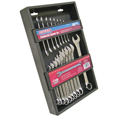 General description This Faithfull Combination Spanner Set includes 18 professional high-quality combination spanners made from chrome vanadium steel. Each spanner is hardened, tempered, and satin chrome plated for enhanced corrosion protection. The set features sizes ranging from 6mm to 24mm, ensuring a versatile tool selection for various applications. Technical specifications Material: Chrome vanadium steel Sizes included: 6, 7, 8, 9, 10, 11, 12, 13, 14, 15, 16, 17, 18, 19, 20, 21, 22, and 24mm Manufactured to: DIN 3113 Usage Broached jaws and rings provide consistent tolerance and a guaranteed accurate fit. Both the jaw and ring end are set at a 15° offset for ease of use in awkward positions.