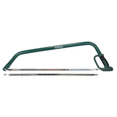 General description The Faithfull Countryman Bowsaw is a versatile hand tool designed for efficient cutting of wood. Suitable for gardeners, builders, farmers, and DIY enthusiasts, it offers excellent performance for various woodworking tasks. Technical specifications Blade length: 755mm (30 inches) Frame material: Tubular steel Handle: Soft-grip with plastic finger guard Teeth: Double-ground, induction hardened for durability and sharpness Compatibility and accessories Compatible with standard replacement blades for bowsaws Includes two blades: one for dry wood ('peg' tooth) and one for wet wood ('raker' tooth) Installation Attach the blade to the frame using the lever tensioner for secure fitting Ensure the blade is properly aligned before use Usage Use the 'peg' tooth blade for cutting dry wood Use the 'raker' tooth blade for cutting wet or green wood Apply steady, even pressure during cutting for best results