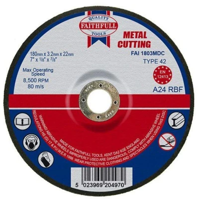 General description Faithfull Depressed Centre Metal Cutting Discs are designed for optimal cutting performance on stainless steel and high-grade metals. Manufactured with Aluminium Oxide abrasive grit, these discs feature fibreglass reinforcement and resin bonding for enhanced safety and durability. They allow for better access in various applications, making angle grinders more versatile. Technical specifications Bore: 22.23mm Diameter: 180mm Thickness: 3.2mm Type: Depressed Centre Manufacturer Part Number (MPN): FAI1803MDC EAN: 5023969204970 Installation Metal cutting discs must always be mounted correctly and presented to the workpiece at a 90-degree angle to ensure effective cutting. Ensure that the correct wheel is chosen based on the material being cut. Usage These discs are suitable for use with a variety of machines, ranging from mini-grinders to stationary cutting-off machines. Typical applications include cutting keyways and general metal cutting. It is important to avoid