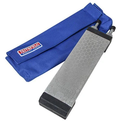General description The Faithfull Diamond Sharpening Stone Kit is designed for quick, easy, and effortless sharpening of various blades and tools. This double-sided sharpening stone features an 8mm thick metal surface electroplated with monocrystalline diamond in two grits: 400G Coarse and 1000G Fine. The stone can be easily accessed by releasing it from the docking station and turning it over. Unlike traditional abrasive sharpening stones, this diamond stone maintains a flat sharpening surface that does not groove over time, ensuring consistent edges on precision cutting tools such as wood chisels and plane irons. Technical specifications Dimensions: 200mm x 70mm Thickness: 8mm Grits: 400G Coarse & 1000G Fine Docking station adjustable for stones from 135mm to 216mm in length Docking station recess depth: 6mm Compatibility and accessories Compatible with carbon steel, HSS, and tungsten carbide tools Can be used to abrade glass, ceramic tiles, and porcelain Supplied with a handy