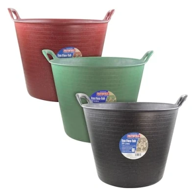 ManoManoGeneral description The Faithfull Eco Flex Tub 25 litre Triple Pack is designed for top performance and durability. Made from post-consumer recycled material obtained from beverage cartons, it is crafted from low-density polyethylene blended with aluminium, making it a sustainable and dependable option. The tub is also 100% recyclable. Technical specifications Capacity: 25 litres Load capacity: 150 kg Material: Low-density polyethylene blended with aluminium Cold and heat resistant Other information Reinforced handles for added durability