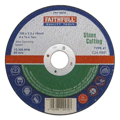 General description Faithfull Stone Cut Off Disc 100 x 3.2 x 16mm is designed specifically for cutting stone materials using various power tools. Manufactured with silicone carbide abrasive grit, reinforced with fibreglass and resin bonded, this disc ensures both safety and optimal cutting performance. Technical specifications Diameter: 100mm Bore: 16mm Type: Flat Material: Silicone carbide abrasive Standard: EN 12413 Compatibility and accessories Compatible with mini-grinders Compatible with stationary cutting-off machines Installation Ensure the disc is correctly mounted on the machine with the bore aligned properly Always present the disc to the workpiece at a 90º angle Check that the guard is properly adjusted to deflect sparks and dust Usage Use the disc solely for cutting stone materials Maintain the recommended revolutions per minute (RPM) to ensure safety and performance Inspect the disc regularly for damage or wear and replace if necessary Other information