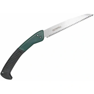 General description This folding pruning saw features a high-quality SK5 steel blade designed for clean cuts and durability. It is ideal for pruning and removing dead wood from trees and shrubs. The blade folds into the handle for safe storage and transport, making it convenient for gardening tasks. Technical specifications Blade length: 250mm (10 inches) Blade material: SK5 steel Blade type: Triple-ground, hardened teeth Blade action: Cuts on both push and pull strokes Handle: Soft-grip with press lever for blade release Safety: Blade lock to prevent accidental closure Compatibility and accessories Compatible with standard pruning blades Includes a folding mechanism for safe storage Installation Open the folding blade by pressing the release lever Ensure the blade is securely locked in place before use Usage Use for pruning branches and removing dead wood from trees and shrubs Apply gentle, controlled pressure for clean cuts Fold the blade back into the handle after use for safety