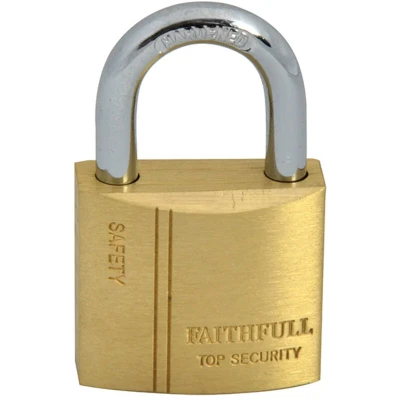 General description The Faithfull Brass Padlock features a robust 30mm brass body, a hardened, cut- and saw-resistant steel shackle, and a self-locking mechanism, ensuring a high level of security. Designed for outdoor use, it offers excellent durability and weather resistance. The padlock is equipped with a quality brass 4-pin tumbler mechanism and is supplied with three keys for convenience. Technical specifications Body Width: 30mm Internal Shackle Dimensions (WxH): 15.0 x 16.1mm Shackle Diameter: 5.0mm Security Level: 4/9 Material: Brass body with steel shackle Compatibility and accessories Compatible with various outdoor security applications such as gates, lockers, and storage units Supplied with three keys Installation Insert the shackle through the hasp or locking point Turn the key to lock or unlock the padlock Ensure the shackle is fully engaged for maximum security Usage Use to secure gates, lockers, sheds, and other outdoor equipment Lock and unlock with the provided keys