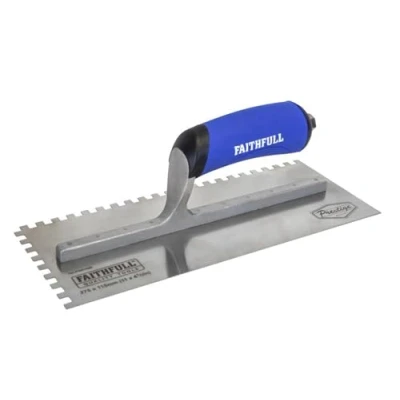 General description This Faithfull Prestige Notched Trowel features a high-grade stainless steel blade with two notched sides, designed for applying adhesive evenly before tile installation. It also includes straight edges for finishing and cutting, making it suitable for both professional and DIY tile work. Technical specifications Blade size: 275 x 115 mm (11 x 4.1/2 inches) Notch size: 6 mm Material: Stainless steel blade, aluminum handle Compatibility and accessories Compatible with various tile adhesives and thinset mortars Suitable for wall and floor tile installation Installation Use the notched side to spread adhesive evenly on the surface Utilize straight edges for finishing, smoothing, and cutting off excess adhesive Usage Apply adhesive to the surface using the notched side of the trowel Hold the trowel at a consistent angle for even coverage Finish the application with straight edges for a clean look Other information Durable and lightweight aluminum shank riveted to the