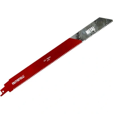 ManoManoGeneral description Faithfull Metal Sabre Saw Blades feature carbide metal technology for increased durability and stability. They are ideally suited for cutting tough metals with ease. Technical specifications Length: 304 mm Teeth per inch (TPI): 8 Material: Carbide Maximum cutting thickness: 14 mm Compatibility and accessories Compatible with all common S-shank reciprocating saws Usage Ideal for accurately cutting cast iron, high-strength alloys, and stainless steel