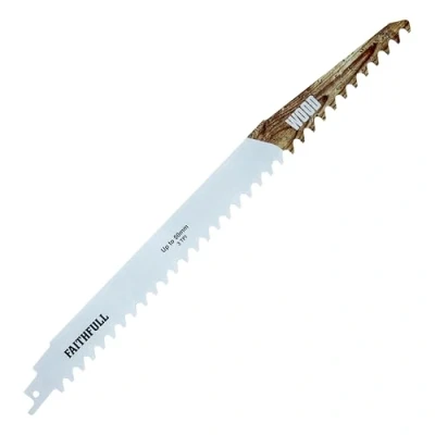 ManoManoGeneral description Faithfull Wood Sabre Saw Blades feature carbide metal technology for increased durability and stability. With 3 teeth per inch, they are designed for cutting tough wood with ease. Technical specifications Length: 304mm Teeth per inch: 3 TPI Maximum cutting depth: 50mm Compatibility and accessories Compatible with all common S-shank reciprocating saws Usage Ideal for accurately cutting soft and hard wood