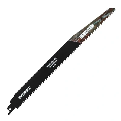 ManoManoGeneral description Faithfull Demolition Sabre Saw Blades feature carbide metal technology for increased durability and stability. They are designed for cutting through a variety of materials, making them ideal for tasks such as pallet repair. Technical specifications Length: 304 mm Teeth per inch (TPI): 6 Compatibility and accessories Compatible with all common S-shank reciprocating saws Usage Suitable for cutting wood, plastic, non-ferrous metals, and composite materials Ideal for accurately cutting wood up to 50 mm that may contain metal
