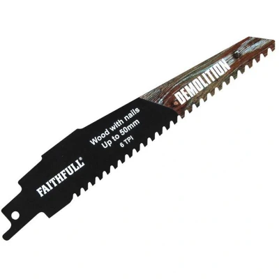 ManoManoGeneral description Faithfull FAISBS940HM Demolition Carbide Sabre Saw Blade is designed for precision cutting of various materials. With a length of 152mm and a tooth count of 6 TPI, this blade is ideal for cutting wood up to 50mm thick, as well as metal ranging from 3.9mm to 5mm. The carbide metal technology enhances durability and stability, making it suitable for demanding tasks. Technical specifications Length: 152mm Teeth per inch (TPI): 6 Cutting capacity for wood: up to 50mm Cutting capacity for metal: 3.9-5mm Compatibility and accessories Compatible with all common S-shank reciprocating saws. Usage Ideal for cutting wood embedded with nails, making it great for pallet repair. Can also cut through plastic, non-ferrous metals, and composite materials such as pipe and carbon steel.