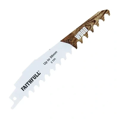 ManoManoGeneral description Faithfull Wood Sabre Saw Blades feature carbide metal technology for increased durability and stability. With 3 teeth per inch and a length of 152mm, they are ideally suited for cutting tough wood with ease. Technical specifications Length: 152mm Teeth per inch: 3 TPI Cutting capacity: up to 50mm Compatibility and accessories Compatible with all common S-shank reciprocating saws Usage Ideal for accurately cutting soft and hard wood