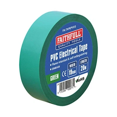General description This Faithfull PVC Electrical Tape in green is versatile and suitable for a multitude of tasks in both home and workplace settings. With a width of 19mm and a length of 20m, this tape is designed to meet various electrical needs. Technical specifications Width: 19mm Length: 20m Temperature range: -5°C to 60°C Flame retardant Conforms to BS EN 60454 CE and RoHS compliant Other information