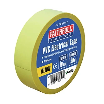 General description This yellow PVC electrical tape is suitable for various tasks in and around the home and workplace. It is designed to provide reliable insulation and protection for electrical connections. Technical specifications Colour: Yellow Width: 19mm Length: 20m Temperature resistance: from -5°C to 60°C Flame retardant conforming to BS EN 60454 Compatibility and accessories Compatible with standard electrical wiring and insulation applications No additional accessories included Installation Wrap the tape around electrical wires or components, ensuring full coverage for insulation and protection Apply firmly to ensure adhesion and insulation quality Usage Use for insulating electrical connections Repairing damaged wiring Color-coding wiring systems Suitable for indoor applications in environments with temperatures between -5°C and 60°C Other information
