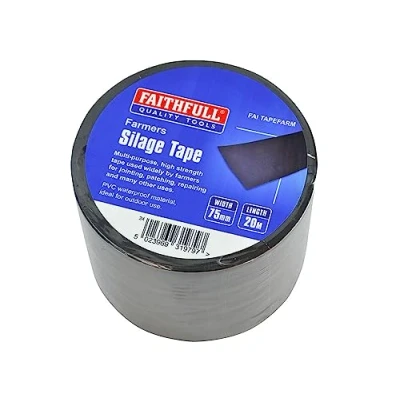 General description Faithfull Farmer's Silage Tape is an extra wide tape made from durable, high-strength PVC, designed for various repair and insulation tasks around the farm. It is ideal for silage patching, electrical insulation, and banding applications. Technical specifications Color: Black Width: 75mm Length: 20m Installation Apply by cutting to the desired length and securing as needed for repair or insulation purposes. Usage Use for patching silage, electrical insulation, or banding around the farm. Other information