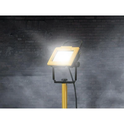 The Faithfull SMD LED Tripod Site Light features the latest LED lighting technology and is designed for both commercial and domestic use. The head contains an SMD LED unit that provides a high light output of 3600 lumens. SMD LEDs are maintenance free and more resilient to impact damage that can cause conventional halogen tubes to fail if a light is hit or knocked over. LEDs have the added advantage of a low power consumption and a cool running temperature that avoids the burn hazards commonly associated with halogen lighting. Ideal for indoor and outdoor use, the slim and lightweight die-cast aluminium lamp head is IP44 rated for water and dust ingress protection. The impact resistant glass lens makes these site lights a durable solution. The lamp head is fully adjustable and mounted on a sturdy tubular steel tripod. Two twist grip locks enable the light height to be quickly adjusted between 1010mm and 2000mm. Supplied with 2.5m of cable fitted with an appropriate approved BS plug.