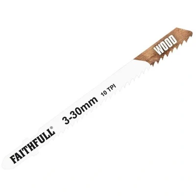 General description These Faithfull Jigsaw Blades are made from High Carbon Steel (HCS) and are designed for clean and precise straight cuts in various materials. They are suitable for both hard and soft woods, as well as laminates, plywood, chipboard, and plastics. Ideal for woodworking projects requiring accurate cuts. Technical specifications Type: T-shank (High Carbon Steel - HCS) Cutting length: 75mm Teeth per inch (TPI): 10 Quantity: Pack of 5 blades Compatibility and accessories Compatible with jigsaws that accept T-shank blades Installation Insert the blade into the jigsaw's blade holder, ensuring it is securely locked in place before use. Usage Use for cutting wood, chipboard, plywood, laminated boards, and plastics. Ensure the material is properly supported and clamped before cutting for best results. Other information