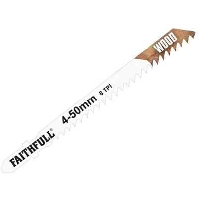 General description These Faithfull Wood Jigsaw Blades (T111C) are designed for precise straight cuts in both hard and soft woods, as well as laminates, plywood, chipboard, and plastics. Made from high-quality High Carbon Steel (HCS), they offer durability and clean cutting performance. Technical specifications Material: High Carbon Steel (HCS) Cutting length: 75mm Tooth Pitch (TPI): 8 Pack quantity: 5 blades Compatibility and accessories Compatible with jigsaw tools that accept T-shank blades Installation Insert the blade into the jigsaw's blade holder, ensuring it is securely locked in place before use. Usage Use for cutting straight lines in wood, laminates, plywood, chipboard, and plastics. Operate at appropriate speeds for the material to achieve clean cuts. Other information