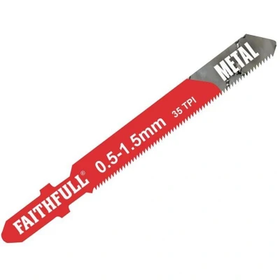 General description This pack contains five Faithfull straight cutting jigsaw blades designed for precise cuts in very thin sheet metals, non-ferrous metals, and aluminium. They are suitable for detailed and clean cuts in various metalworking projects. Technical specifications Type: High Speed Steel ('T' Shaft) Cutting length: 50mm Teeth per inch (TPI): 35 Pack quantity: 5 blades Compatibility and accessories Compatible with standard jigsaws that accept T-shank blades Installation Insert the blade into the jigsaw's T-shank holder Ensure the blade is securely fixed before use Usage Use for cutting very thin sheet metals, non-ferrous metals, and aluminium Operate at appropriate speeds for clean cuts Other information
