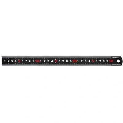 General description The Faithfull Matt Black Stainless Steel Measuring Rule is an essential tool for accurate measurements, suitable for a wide range of applications. Manufactured from hardened stainless steel, this rule features a matt black finish to reduce fingerprint marks, along with easy-to-read white and red engraved markings for maximum visibility. Technical specifications Material: Hardened stainless steel Length: 300mm Finish: Matte black Markings: White and red engraved for easy reading Compatibility and accessories Suitable for general measuring tasks in DIY, home improvement, woodworking, and construction projects Can be used with other measuring tools and accessories for precise work Installation No installation required; simply use the ruler for measuring Usage Use the engraved markings to measure lengths accurately Handle with care to maintain the finish and accuracy