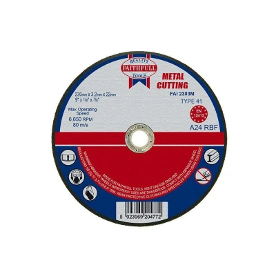 General description Faithfull Metal Cut Off Disc is designed for cutting metal with precision and safety. Manufactured using Aluminium Oxide abrasive grit, these discs feature fibreglass reinforcement and are resin bonded to ensure optimal cutting performance. With a thickness of 3.2mm, they are suitable for fine cutting on stainless steel and high-grade metals. It is crucial to use the correct disc type based on the material being cut and to mount it properly. Technical specifications Diameter: 230mm Thickness: 3.2mm Bore: 22.23mm Type: Flat Manufacturer Part Number (MPN): FAI2303M EAN: 5023969204772 Installation Ensure the disc is properly mounted on the cutting machine. Always present the disc to the workpiece at a 90-degree angle for effective cutting. Usage This metal cut off disc is suitable for use with various machines, ranging from mini-grinders to stationary cutting-off machines. It is important to never use the disc for grinding. Other information Safety tips: Read the