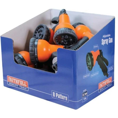 General description The Faithfull 8 Pattern Adjustable Spray Gun is designed for versatility and ease of use. It features a durable plastic body and a comfort-grip handle, making it suitable for various watering tasks. The spray gun is equipped with a 12.7mm (1/2in) male hose connector for easy attachment to standard hoses. With its eight adjustable spray patterns, it can cater to different watering needs. Technical specifications Material: Plastic Connector: 12.7mm (1/2in) male hose connector Patterns: Cone, centre, mist, shower, flat, angle, full, soaker MPN: YM7202BUL EAN: 5023969264653 Usage The spray gun delivers eight different spray patterns that can be easily selected by turning the front faceplate. This allows for tailored watering, whether you need a gentle mist for delicate plants or a strong jet for cleaning tasks. The trigger features an auto-lock function, enabling hands-free operation for prolonged use. Other information