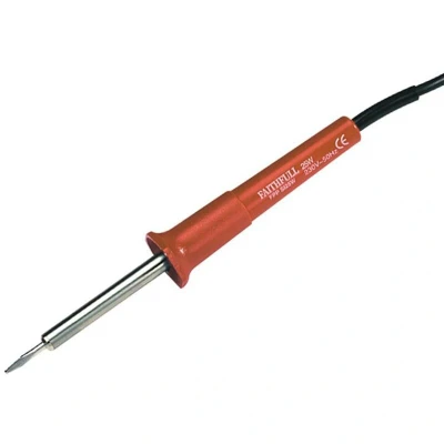 General description The Faithfull Lightweight Soldering Iron is designed for soft soldering of metal alloys, brass, and copper. It features a heat-resistant handle and is ideal for fine soldering tasks, hobby work on circuit boards, jewellery, models, and repair work on electrical items. The working temperature is reached quickly, ensuring efficient soldering, and a metal holder is included to safely rest the hot iron when not in use. Technical specifications Input Power: 25W Voltage: 230/240V Max Temperature: 380°C Tip Width: 2mm Other information