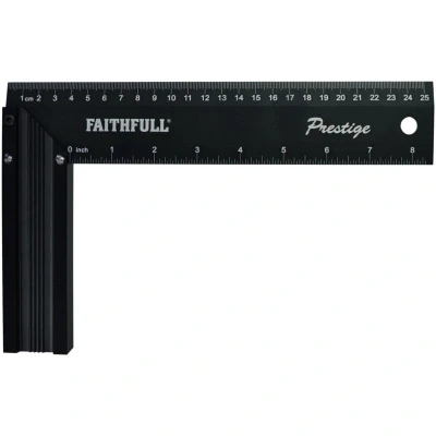 General description The Faithfull Prestige Black Aluminum Try Square is a versatile and accurate woodworking tool, designed for both professional and DIY use. Manufactured from aluminum and CNC machined for high precision, it features ruled metric and imperial markings for easy measurement. The black anodized finish provides corrosion and scratch protection, ensuring durability over time. Technical specifications Blade size: 250mm x 30mm Weight: approximately 26.6kg MPN: 718L25 EAN: 5023969319193 Laser engraved gauge for clear reading Compatibility and accessories Includes mitre fence Dust port reducer Push stick Two blade spanners Parallel fence SERIES 30® saw blade Compatible with standard dust extraction systems (Airlock compatible) Usage The Faithfull Prestige Try Square is ideal for marking out 90° angles and is suitable for various cutting tasks. It features a quick bevel lock for easy angle adjustments, making it user-friendly for both novice and experienced users. Other