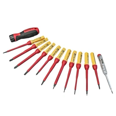 ManoManoGeneral description The Faithfull Interchangeable VDE Screwdriver Set offers a compact and portable solution for electricians and service engineers who need to work in restricted areas. The set is designed for easy access and quick tool changes, making it ideal for those who frequently move between tasks. Technical specifications Number of pieces: 13 Handle type: Auto-Locking, Quick Release Soft Grip Screwdriver Length (including handle): 190/210mm Storage Case Dimensions: 210 x 130 x 44mm VDE certification: Manufactured to BS EN 60900:2012, tested at 10,000V Safe working limit: Up to 1,000V Compatibility and accessories 4 x Slotted Blades: 0.5 x 3 x 100mm, 0.8 x 4 x 100mm, 1 x 5.5 x 100mm, 1.2 x 6.5 x 100mm 2 x Phillips Blades: PH1 x 80mm, PH2 x 100mm 2 x Pozidriv Blades: PZ1 x 80mm, PZ2 x 100mm 3 x Star Blades: TX10 x 100mm, TX15 x 100mm, TX20 x 100mm 1 x Single-Pole Voltage/Mains Tester: 3 x 140mm 100-250V (not VDE certified) Usage The interchangeable design allows for quick blade