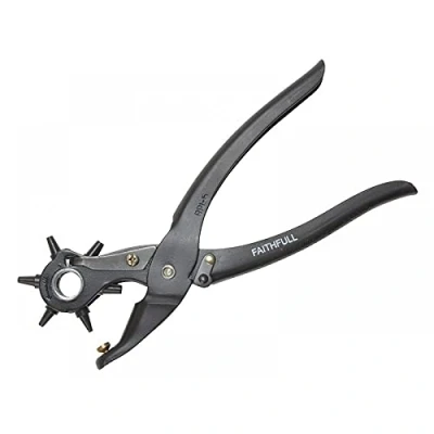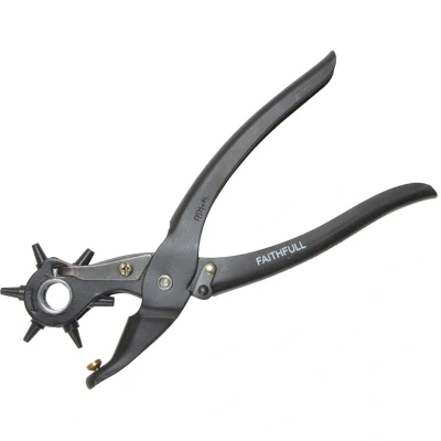 General description The Faithfull Revolving Punch Pliers are designed for creating holes in soft materials such as canvas, leather, soft plastics, and textiles. These pliers feature a revolving spring-loaded punch head that allows for easy selection of the desired hole size, striking a fixed anvil for precision. Technical specifications Material: Hardened heavy gauge sheet metal Coating: Epoxy to protect against rust Hole diameters: 2mm, 2.5mm, 3mm, 3.5mm, 4mm, and 4.5mm