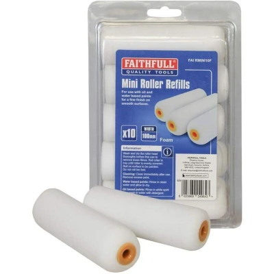 General description Faithfull Dense Foam Mini Roller Refills are designed for use with gloss and emulsion paints on smooth surfaces, providing a fine finish. This pack includes 10 refills, each measuring 100mm (4 inches). Technical specifications Size: 100mm (4 inches) Type: Foam Pack quantity: 10 Compatibility and accessories Compatible with both mini rollers and radiator rollers
