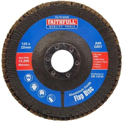 General description The Faithfull Aluminium Oxide Flap Disc is designed for heavy-duty grinding and finishing applications. It features 72 overlapping flaps that enable fast material removal while minimizing the risk of gouging or discoloration. The disc's lightweight design reduces operator fatigue and allows for better control, resulting in a consistent surface finish. It operates cooler and quieter than traditional grinding discs, with less vibration and reduced glazing. The flap disc is self-sharpening and has a longer lifespan—up to 30 times longer than fiber discs—requiring fewer disc changes. Its slightly conical shape makes it ideal for grinding at 15-25 degree angles on contoured surfaces. Suitable for use with angle grinders, it is perfect for final grinding of mild steel, carbon steel, and alloys. Technical specifications Diameter x bore: 125 x 22mm Grit: 80 Material: Aluminium Oxide Number of flaps: 72 Shape: Slightly conical for angled grinding Compatibility and