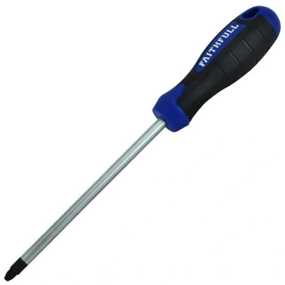 General description Faithfull Pozidriv Tip Screwdrivers are designed for durability and comfort. Featuring a high-quality, hardened, and tempered chrome vanadium steel blade, these screwdrivers are built to last. The black phosphate tip enhances wear resistance and provides a longer working life, while the bi-material soft grip handle ensures maximum user comfort and a secure, non-slip grip. Each handle is equipped with a drive icon for easy identification. Technical specifications Type: Pozidriv Tip Size: PZ3 Blade Length: 150mm (6 inches) Material: Chrome vanadium steel, hardened and tempered Tip: Black phosphate coating Compatibility and accessories Compatible with PZ3 screws and similar fasteners Suitable for use with other screwdriver accessories designed for PZ3 tips Installation Insert the PZ3 screw into the screw head Align the screwdriver tip with the screw head Apply downward pressure and turn clockwise to tighten or counterclockwise to loosen Usage Use with a comfortable