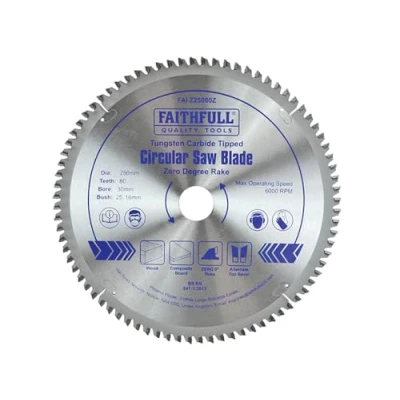 AmazonA professional quality blade with 7mm Tungsten Carbide Tipped teeth to ensure a long working life and accuracy of cut Laser cut expansion slots to improve their performance by reducing heat build up Specially manufactured for use with mitre saws and radial arm saws. All the blades in this range fit most popular makes of power machines For safety purposes, a zero degree blade must be used to avoid kickback when cutting timber by means of lowering the blade onto the workpiece Diameter: 250mm, Weight: 1.87 pounds, Manufacturer: Faithfull