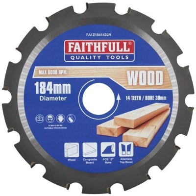 General description Faithfull Professional TCT Circular Saw Blade is designed for cutting wood with the occasional nail. It features 7mm Tungsten Carbide Tipped teeth, ensuring a long working life and precision in cutting. Technical specifications Blade Diameter: 184mm Bore: 30mm Number of Teeth: 14 Rake: NEG Expansion Slots: Laser cut to reduce heat build-up Compatibility and accessories All blades in this range fit most popular makes of power machines. Usage This blade is specifically designed for nail cutting, making it suitable for wood that may contain the odd nail. Other information MPN: FAIZ1841430N EAN: 5023969216393