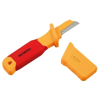 AmazonHigh-Quality 60 CRV Steel Blade – Offers exceptional sharpness and durability, delivering smooth, precise cuts on various cables and wires. Ideal for electrical installations, networking and general maintenance. Ergonomic PP & TPR Insulated Handle with Non-Slip Grip - Injected moulded handle provides a comfortable and secure grip for improved control and reduced fatigue, even during prolonged use. Safe & Reliable 1000V Protection – Individually tested at 10,000V before leaving the factory to guarantee a safe working limit of up to 1,000V, offering reliable insulation when working with electrical cables and components. Ideal for professional electricians, technicians and DIY users, ensuring dependable performance in daily applications. Compact 200mm Design with 55mm Blade - Allows easy, everyday handling for clean, accurate cable cutting, stripping and shaping Protective Blade Guard – Helps prevent accidental cuts and damage when knife is not in use, enhancing safety and keeping cutting edge sharp for longer., Manufacturer: Faithfull