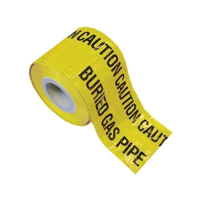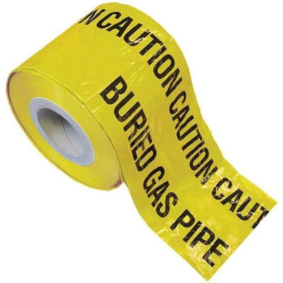 General description The Faithfull Gas pipe warning tape is yellow with black writing, indicating that caution should be taken due to buried gas services. This vivid color tape is designed to warn excavation crews of the existence of buried pipes or cables before damage can occur. The tape is impervious to alkalies, acids, and other soil components, and is marked with text indicating the hazard type. Technical specifications Size: 150mm wide Length: 365m
