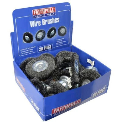 General description A selection of wire wheels of assorted sizes and shapes, with 1/4 inch shanks to suit most mains and cordless drills. This wire brush assortment contains 20 pieces designed for surface preparation, rust removal, decarbonising engines, and cleaning tools. The set includes 10 cup brushes of 60mm diameter and 10 circular brushes of 100mm diameter. Although sold as a bulk pack, individual brushes may be available upon request. Technical specifications Number of pieces: 20 Brush types: Cup brushes and circular brushes Cup brush size: 60mm diameter Circular brush size: 100mm diameter Shank size: 1/4 inch Compatibility and accessories Compatible with most mains and cordless drills Not suitable for die grinders or high-speed air tools Installation Insert the brush shank into the drill chuck and tighten securely before use. Usage Use for surface preparation, rust removal, engine decarbonising, and cleaning tools. Ensure the drill is set to appropriate speed and apply gentle