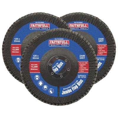 ManoManoGeneral description The Faithfull Zirconia Abrasive Jumbo Flap Disc is a pack of 3 discs, each measuring 125 x 22mm with an 80 grit. These discs are designed for final grinding and feature a slightly conical shape, making them ideal for grinding at 15–25 degree angles on contoured surfaces. They are suitable for use with a 125mm angle grinder. Technical specifications Dimensions: 125 x 22mm Grit: 80 Max Speed: 80m/s (12,200 RPM) Material: Zirconia Alumina, resin bonded Compatibility and accessories Compatible with 125mm angle grinders Usage Suitable for use on wood, metal, plastic, and stainless steel