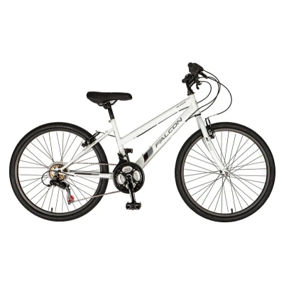The Falcon Aurora 24" Kids Hybrid Bike is a lightweight, durable junior bike designed for ages 9-12, featuring a low-step steel frame, 18-speed Shimano gearing, adjustable components, and reliable V-brakes—ideal for multi-terrain riding and growing children (inside leg 56-67 cm).