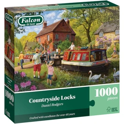 Tranquil 1000-piece jigsaw puzzle, perfect for a serene escape into the countryside. Illustrated by Daniel Rodgers, showcasing the beauty of Countryside Locks on a Summer's Day. Part of Falcon's Scenery puzzle theme, capturing a picturesque scene with boats navigating locks. Finished puzzle measures 68 x 49cm, creating a poster-like display of the peaceful Summer scene. Crafted with precision using premium recycled board, ensuring each piece maintains its original shape., Manufacturer: Jumbo