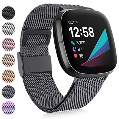 Pefectly Fit: This replacement metal strap is pefectly compatible with Fitbit Versa 4/Fitbit Versa 3/Fitbit Sense Smartwatch (2020 Release). NOTE: the watch is NOT included Premium Material: The strap compatible for fitbit versa 3 strap are made of stainless steel with polished edge, this strap surface is plated by VBA vacuume technology, it's lightweight and breathable, brings you a comfortable wear feeling Strong Magnet Closure Clasp: Small size fits for 5.5"-7.1" wrist. Large size fits for 7.1"-8.7" wrist. The magnet clasp design makes the versa sense strap size can be freely adjust according to your wrist. This no buckle designed band is flexibility and comfort than the traditional buckle style Secure Connector: These versa 4 straps are fully compatible with Fitbit standard mounting system, so the strap seamlessly attaches to your smartwatch quickly and easily. No worry about falling off Multiple Colors Available: Various colors of metal bands can personalize your versa 3/sense watch to match your daliy style in different occasions. Available in black, silver, rose gold, champage, royal gold, grey and colorful