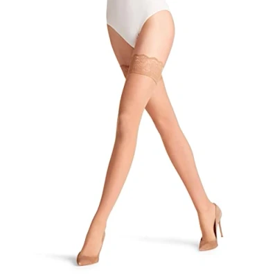 Single pack of sheer hold-ups for women and teenage girls in a nylon blend soft on the skin; 20 denier; plain non-shiny matt pattern with a luxurious transparency; excellent gift for Christmas, Easter, birthday, Mother's Day or Valentine's Day Transparent, thin stay-up with feminine lace design; stays on the leg, non-slip thanks to silicone coating; does not require suspenders; seamless on leg; excellent with short dresses and skirts, with an elegant dress, to wear at work Please do not moisturise your legs before wearing this stocking; hold-up stockings with a fine and elegant mesh structure and with an excellent shape and colour retention even after repeated washing; machine wash 30°C gentle Special and innovative knitting techniques guarantee a fine stitch pattern, a slip-free and wrinkle-free fit, a high wearing comfort, a long durability and a protection against pressure points Model number for the FALKE women's Matt Deluxe stay ups: 41520; available in sizes: 8.5-9 (S Ι UK shoe 2.5-4), 9.5-10 (M Ι UK shoe 5-5.5), 10.5-11 (L Ι UK shoe 6.5-8) FALKE, a family business founded in 1895, stands on a firm foundation of values: unconditional quality, the highest craftsmanship, modern and innovative products for generations