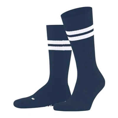 Single pack of sport socks for men, women, boys or girls made of a soft cotton-rich fabric kind to the skin; crew socks with ribbed texture, plain pattern and retro stripe design on cuff; designer logo on calf and sole; available from UK size 4 to 12.5 Thick, light striped crew sock for summer or winter with cushioned plush sole for comfort; ideal with casual looks and trainer shoes; high quality with the use of premium cotton and construction with reinforced stress zones for an optimum durability Comfy crew socks in a knee "LA" length that covers the calf area up to the knees; look excellent combined with trainers for a trendy look; excellent shape and colour retention even after repeated washing; machine wash 40°C Special knitting techniques adapted to the anatomical differences of the right and left foot ensure a high comfort, slip-free and wrinkle-free fit, long durability and protect against pressure points Model number for the FALKE unisex Dynamic crew socks with rib for man, woman, boy or girl: 12601; available in sizes: 37-38 (UK 4-5), 39-41 (UK 5.5-7.5), 42-43 (UK 8-9), 44-45 (UK 9.5-10.5), 46-48 (UK 11-12.5) FALKE, a family business founded in 1895, stands on a firm foundation of values: unconditional quality, the highest craftsmanship, modern and innovative products for generations
