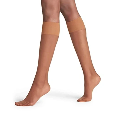 Single pack of knee-high pop socks for women and teenage girls in a nylon blend extra soft on the skin; ultra sheer 12 denier; plain pattern with a glossy finish; give your leg an incredibly natural look; available in black and a range of skin colours 12 den extra-fine knee-high stockings for ladies with wide tops for a soft grip on the leg and an optimum comfort; suitable for diabetics; solid design ideal for dress or casual looks or to wear at work; to wear with trousers, skirts, dresses Women's thin, ultra-transparent socks in a long length that cover the calf up to the knees; ideal in summer; long pop socks with excellent shape and colour retention even after repeated washing; machine wash 30°C gentle Special knitting processes adapted to gender-specific proportions, toe and footbed ensure a perfect, slip-free fit; this innovation also ensures a wrinkle-free fit with high wearing comfort, protects against pressure marks and increases the durability of your socks Model number for the FALKE women's Shelina knee-high socks: 41726; available in sizes: 35-38 (UK 2.5-5), 39-42 (UK 5.5-8) Unique FALKE quality since 1895 with a solid foundation of values: unconditional manufacturing and product quality in all facets of the family business and the highest level of craftsmanship by our creative teams with inner diversity; curiosity, a willingness to experiment, to learn and the will to constructively overcome unavoidable resistance to innovation - this is what we stand for as a traditional company; we accompany you at every age with new ideas and modern products