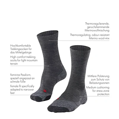 These hiking socks for medium mountain ranges are made of odour-inhibiting, breathable wool and functional material and keep your feet dry thanks to the triple layer moisture-absorbing sole The medium-thickness padding in the areas most subject to wear in these thermal socks offers you a high level of comfort; the flat toe seam prevents pressure points, rubbing and blisters For walking or hiking, these trekking socks offer you secure shoe contact and a high level of cushioning in hiking shoes (categories A-B); we recommend the smaller size if you are between sizes Special knitting techniques adapted to the gender and anatomical differences of the right and left foot ensure a high comfort, a wrinkle-free fit, a long durability and protect against pressure points The high-quality merino wool warms your feet in cold temperatures and cools them in warm temperatures; these all-season sport socks accompany you on your outdoor activities in all weather conditions FALKE, a family business founded in 1895, stands for unconditional quality, the highest craftsmanship, innovative and functional products and plastic-free packaging