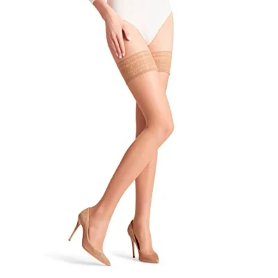 Single pack of ultra-sheer hold-ups for women and teenage girls in a nylon blend soft on the skin; 15 denier; plain slightly shiny pattern; give your legs a natural look; excellent gift for Christmas, Easter, birthday, Mother's Day or Valentine's Day Transparent thin stay-up with modern simple band; stays on the leg, non-slip thanks silicone coating; does not require suspenders; soft seam; seamless on leg; excellent with short dresses and skirts, with an elegant dress, to wear at work Please do not moisturise your legs before wearing this stocking; hold-up stockings with a fine and elegant mesh structure and with an excellent shape and colour retention even after repeated washing; machine wash 30°C gentle Special and innovative knitting techniques guarantee a fine stitch pattern, a slip-free and wrinkle-free fit, a high wearing comfort, a long durability and a protection against pressure points Model number for the FALKE women's Seidenglatt stay ups: 41591; available in sizes: 8.5-9 (S Ι UK shoe 2.5-4), 9.5-10 (M Ι UK shoe 5-5.5), 10.5-11 (L Ι UK shoe 6.5-8) FALKE, a family business founded in 1895, stands on a firm foundation of values: unconditional quality, the highest craftsmanship, modern and innovative products for generations