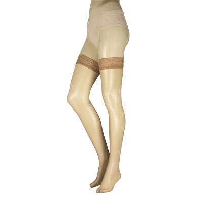 Glow up your legs for summer in a pair of these shimmer finish Falke Shelina 12 Denier Ultra Transparent Hold Ups! Super sheer and light, these self-holing stockings have a subtle ‘make up’ effect that gives a gorgeous sheen of colour to let your lovely legs shine. These superb Falke hold ups are decorated with soft lace tops, lined by silicone anti-slip bands to make sure your stockings stay up and keep looking smooth and sleek. These hold ups have sheer, unreinforced, sandal toes, perfect for summer as they look great with open-toe shoe styles.