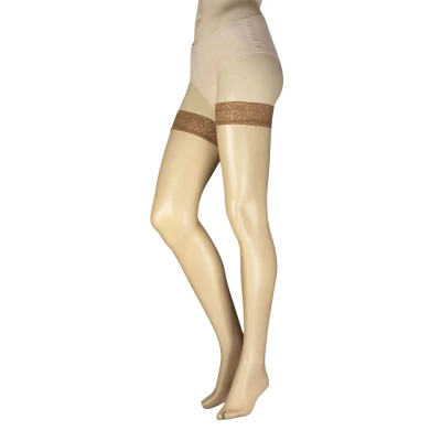 Glow up your legs for summer in a pair of these shimmer finish Falke Shelina 12 Denier Ultra Transparent Hold Ups! Super sheer and light, these self-holing stockings have a subtle ‘make up’ effect that gives a gorgeous sheen of colour to let your lovely legs shine. These superb Falke hold ups are decorated with soft lace tops, lined by silicone anti-slip bands to make sure your stockings stay up and keep looking smooth and sleek. These hold ups have sheer, unreinforced, sandal toes, perfect for summer as they look great with open-toe shoe styles.