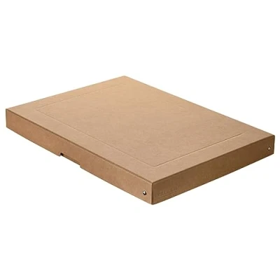 Features: box with lid made of high-quality cardboard (bookbinding cardboard), riveted, with labelling field and handle recess Format: DIN A3, height: 40 mm Puristic, without plastic, without film FSC and vegan certified (guaranteed animal glue-free). Made in Germany Colour: brown